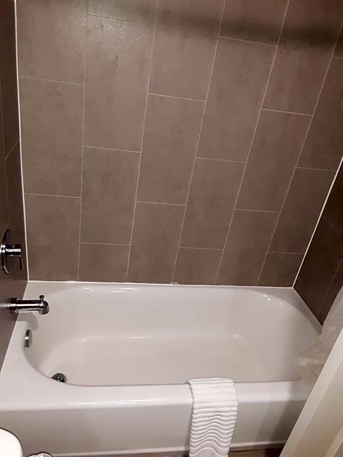 This room features a microwave, small refrigerator, and 55" smart TV . A desk is also included. 2 queen size bed, tub/shower combo and ceiling fan.