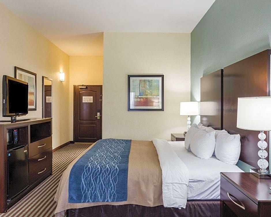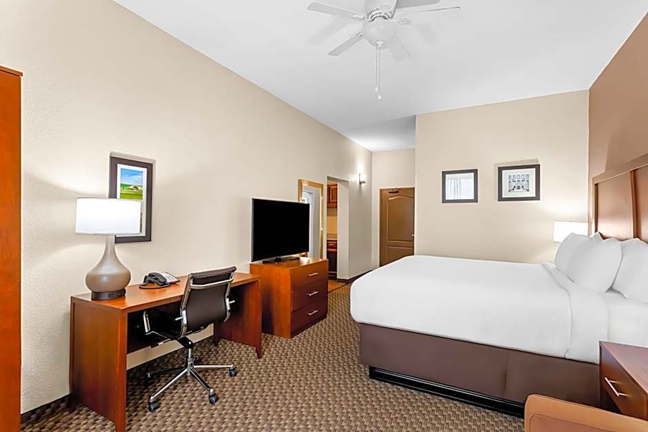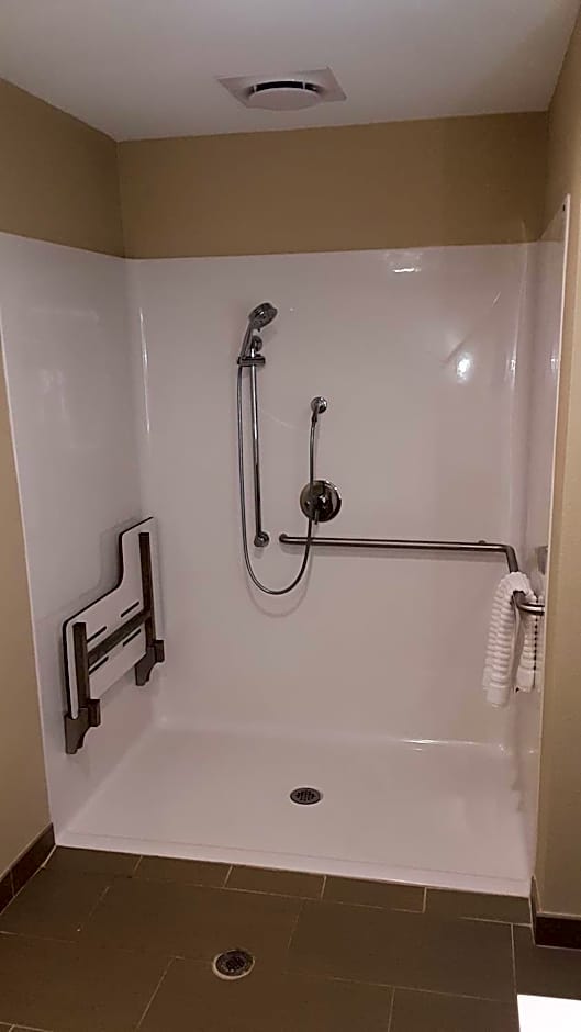 This spacious suite contains 1 king size bed, 55" Smart TV and ceiling fan, in the bedroom, along with sofa sleeper, desk, microwave, mini fridge, ceiling fan and another 55" Smart TV in the seating area. This suite has a walk-in shower unit.